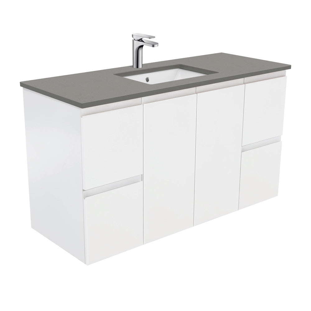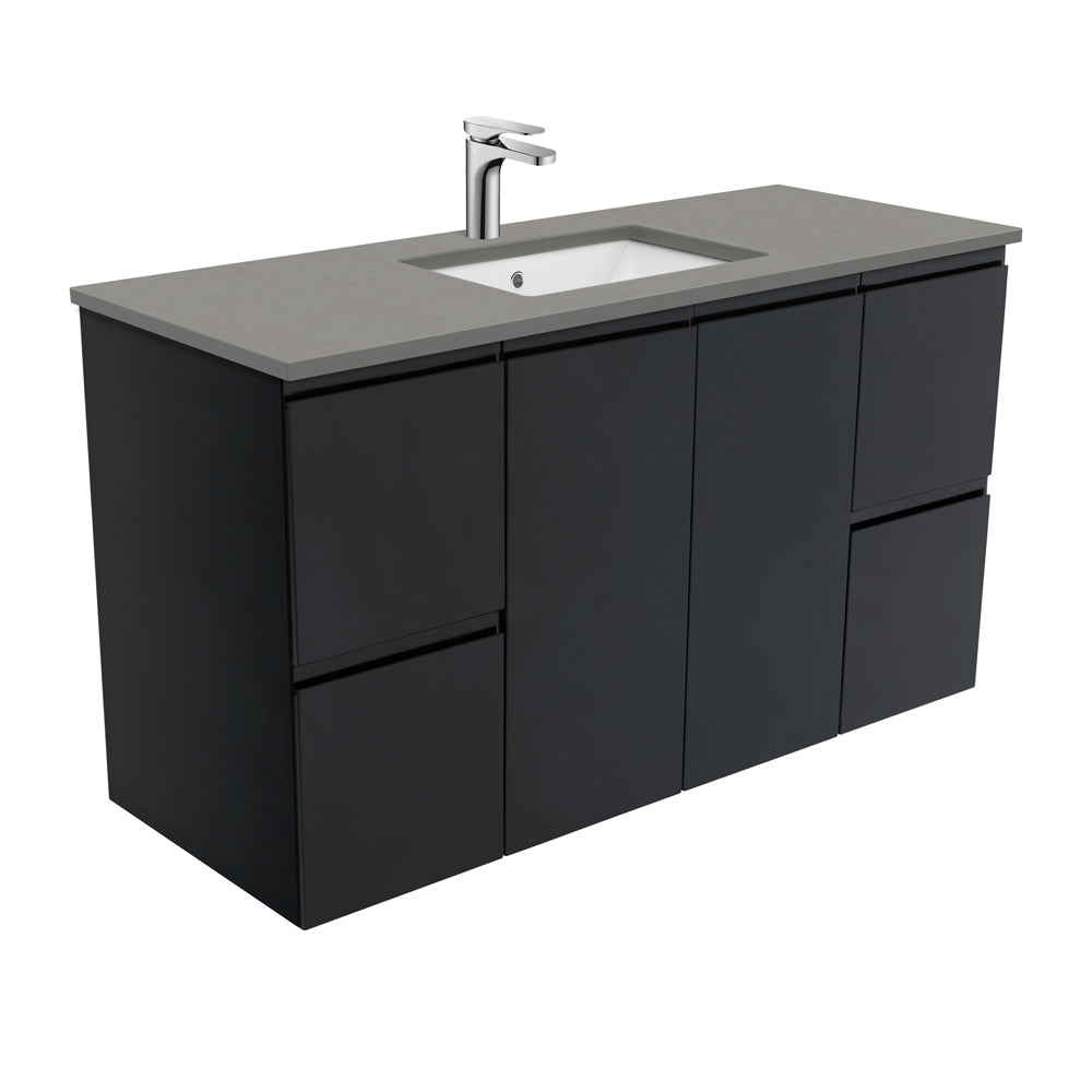 Smooth polished concrete-look reconstituted stone top. Also available without a cutout for use with above counter basins (see our Stone & Timber Tops range).