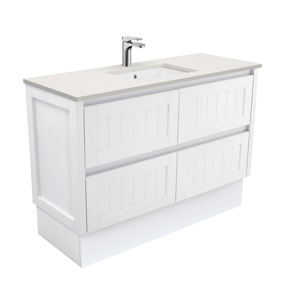 Beautiful pale sand reconstituted stone top with 1mm glass fleck. Also available without a cutout for use with above counter basins (see our Stone & Timber Tops range).