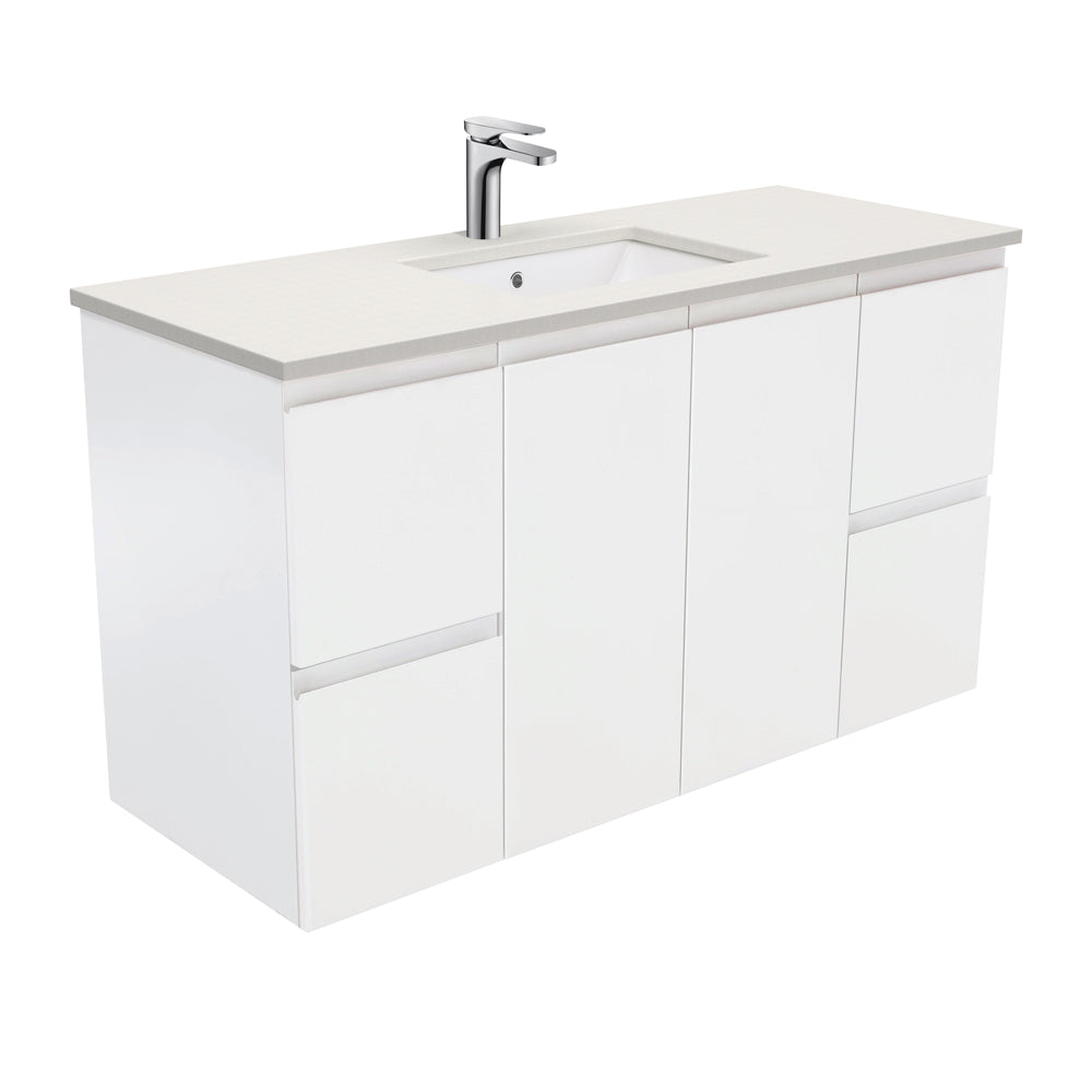 Beautiful pale sand reconstituted stone top with 1mm glass fleck. Also available without a cutout for use with above counter basins (see our Stone & Timber Tops range).