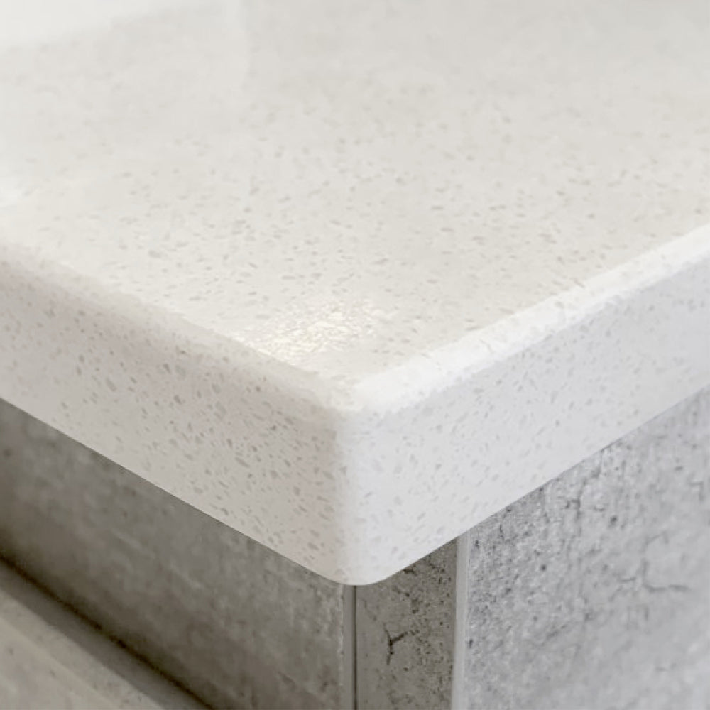 Beautiful pale sand reconstituted stone top with 1mm glass fleck. Also available without a cutout for use with above counter basins (see our Stone & Timber Tops range).