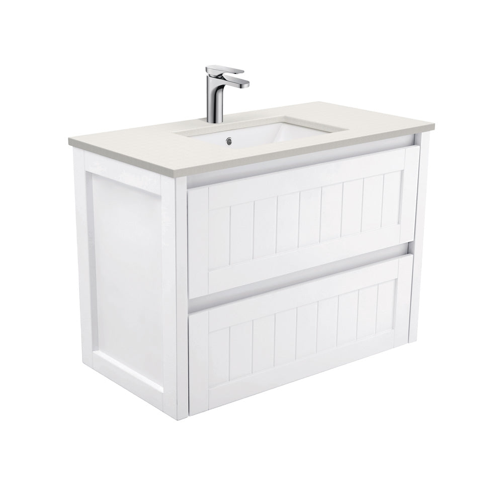 Hampton cabinets feature popular modern-vintage styling with beautifully routered drawer fronts and a smooth satin finish. Wall mounted at your preferred height.